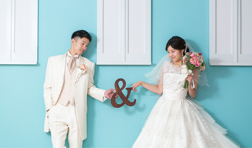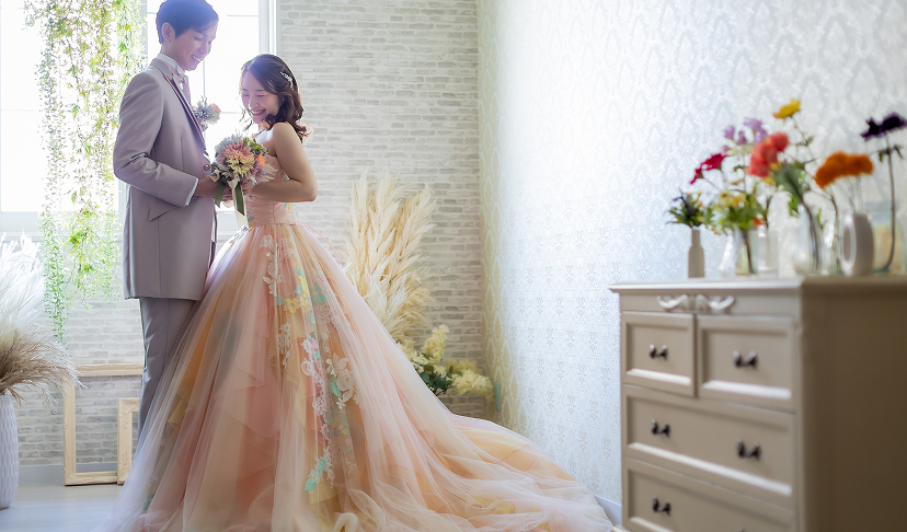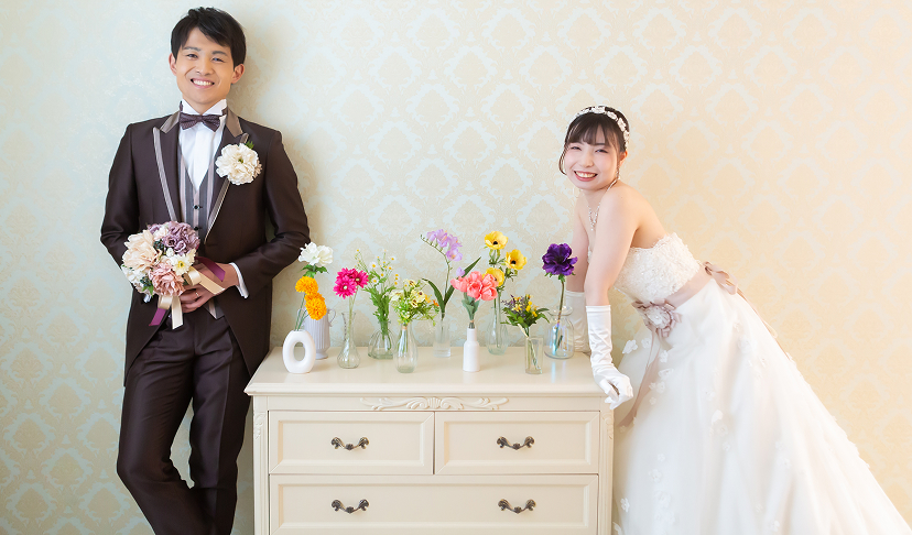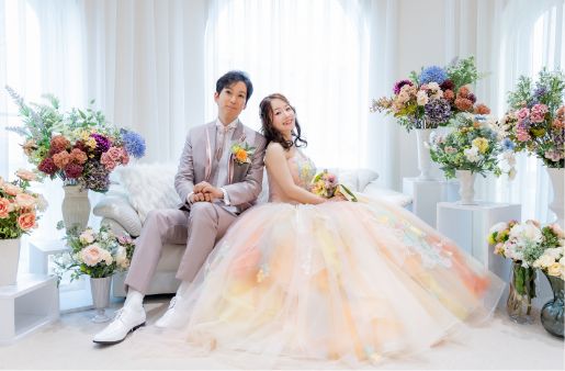 多彩なスタジオセットには沢山のお花飾りや小物を取り揃えております